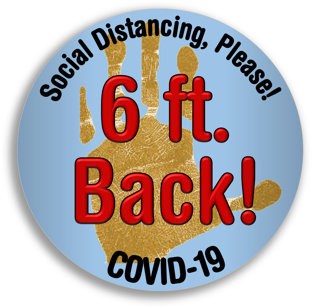 Teddy’s handprint is the background to 6 FT STAND BACK. Surrounded by Social distancing, please! COVID- 19